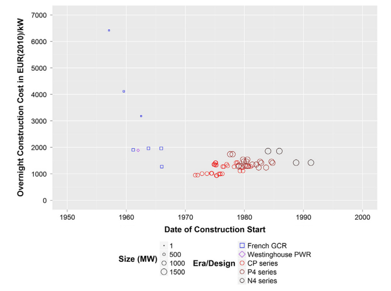 SUA pare să se descurce foarte rău aici, dar majoritatea celorlalte țări au înregistrat o creștere constantă a costurilor de construcție. Iată costurile franceze (care unii experți au sugerat că este o subestimare):