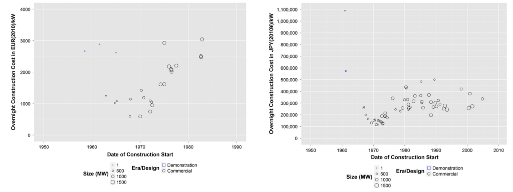 Majoritatea țărilor prezintă un model similar de creștere a costurilor în anii 1980, după care costurile se stabilizează. Singura țară în care costurile de construcție par să fi scăzut constant este Coreea de Sud. Situația excepțională a Coreei de Sud i-a determinat pe unii experți să speculeze că datele privind costurile ar putea să nu fie de încredere.